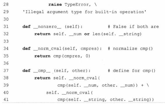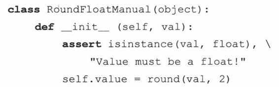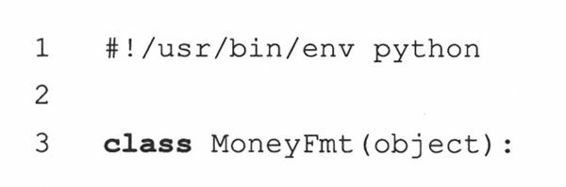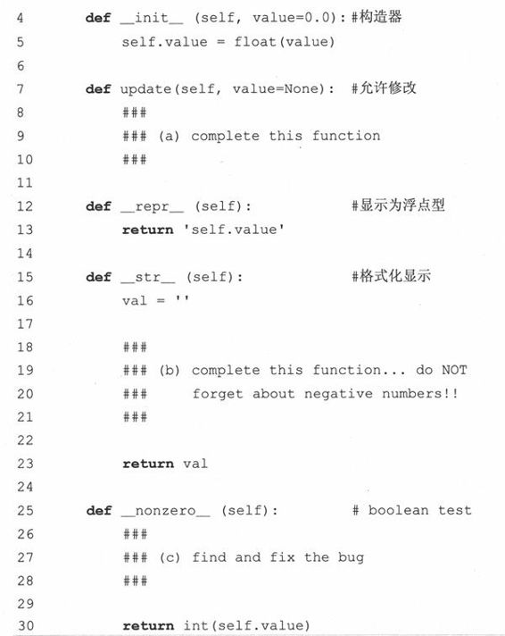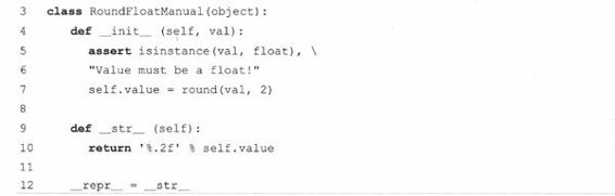 MoneyFmt类里只有一个数据值(即金额),和5个方法(你可以随意编写其他方法)。__init__()构造器对数据进行初始化,update()方法把数据值替换成一个新值,__nonzero__()是布尔型的,当数据值非零时返回True,__repr__()方法以浮点型的形式返回金额;而__str__()方法采用和dollarize()一样的字符格式显示该值。