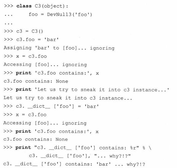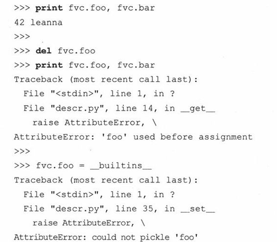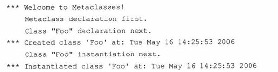 注意我们是如何成功声明Foo定义的;定义Bar时,提示警告__repr__()未实现;FooBar的创建没有通过安全检查,以致程序最后没有打印出关于FooBar的语句。另外要注意的是我们并没有创建任何测试类的实例……这些甚至根本不包括在我们的设计中。但别忘了这些类本身就是我们自己的元类的实例。这个示例只显示了元类强大功能的一方面。