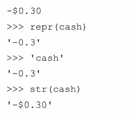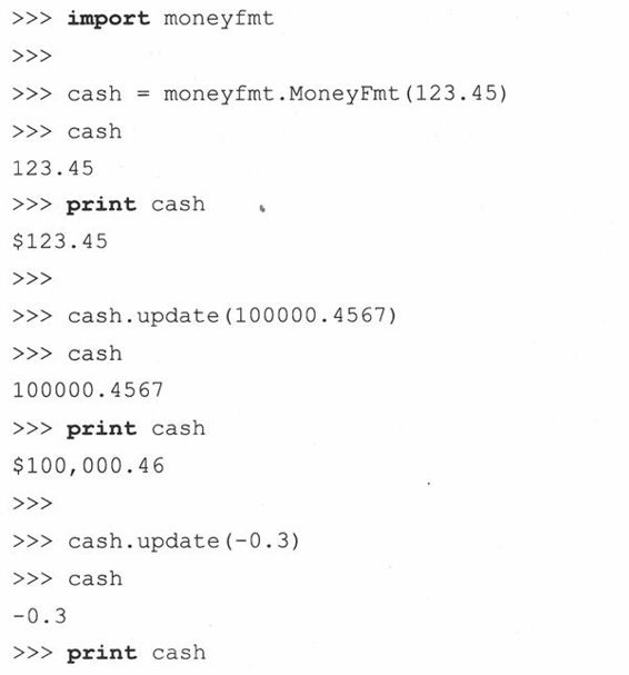 金额转换程序(moneyfmt.py)的主要代码如例13.11所示。网站上有带有充分文件证明(尚不完善)的版本moneyfmt.py。如果我们引入解释程序中的完整类,执行过程将和下面类似: