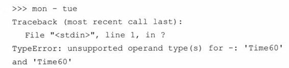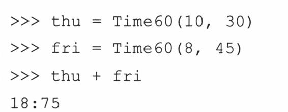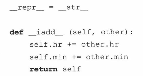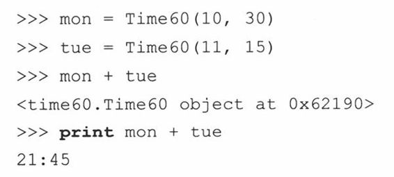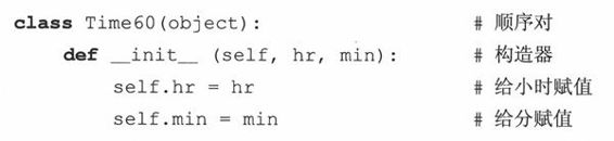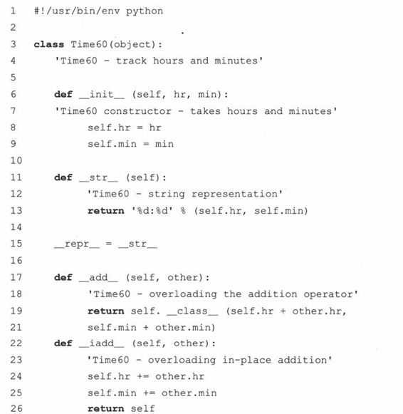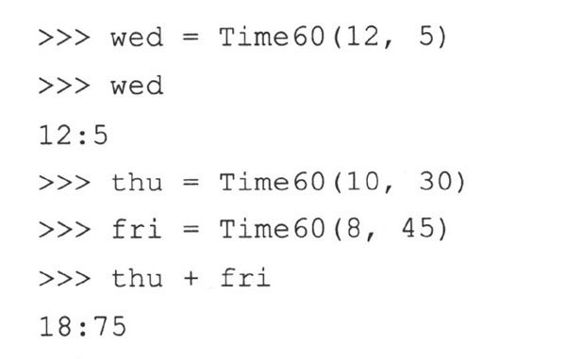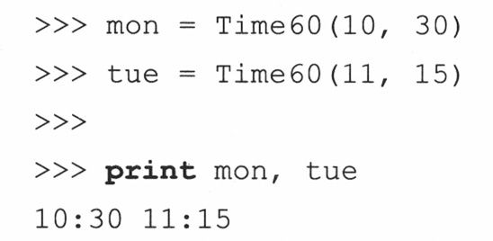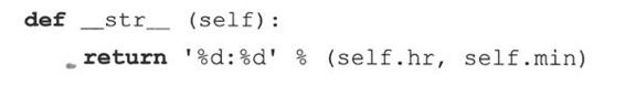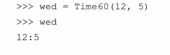 (e) __repr__()函数的实现是有缺陷而且被误导的。我们只是重载了此函数,这样我们可以省去使用print语句的麻烦,使它在解释器中很好的显示出来。但是,这个违背了一个原则:对于可估值的Python表达式,repr()总是应该给出一个(有效的)字符串表示形式。12:05本身不是一个合法的Python表达式,但Time60(‘12:05’)是合法的。请实现它。