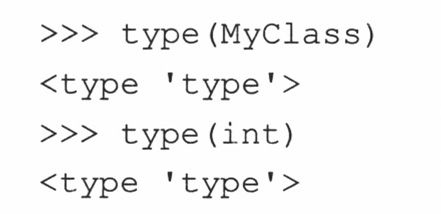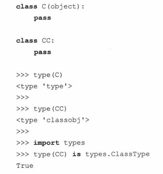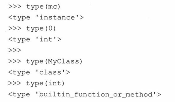 从根本上说,你可以把元类想成是一个类中类,或是一个类,它的实例是其他的类。实际上,当你创建一个新类时,你就是在使用默认的元类,它是一个类型对象(对传统的类来说,它们的元类是types.ClassType)。当某个类调用type()函数时,你就会看到它到底是谁的实例: