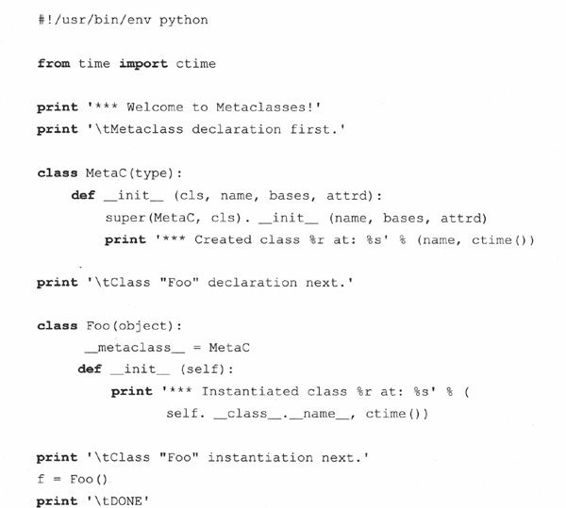 用户一般都不会觉察到元类所提供的创建类(或元类实例化)的默认模板方式。虽然一般我们并不创建元类,还是让我们来看下面一个简单的例子(关于更多这方面的示例请参见本节末尾的文档列表)。