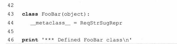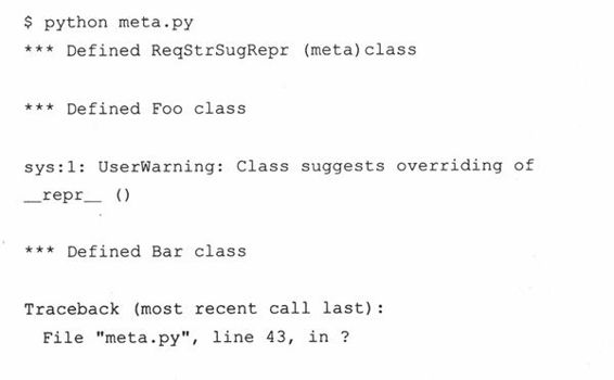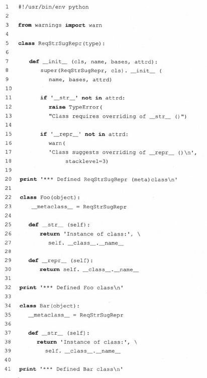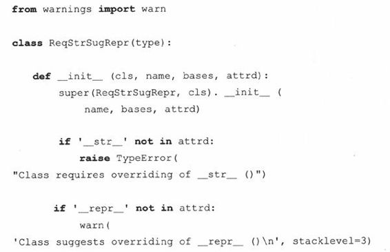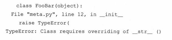 如果你还没有在类中覆盖__repr__()方法,元类会(强烈)提示你这么做,但这只是个警告。如果未实现__str__()方法,将引发一个TypeError的异常,要求用户编写一个同名方法。以下是关于元类的代码: