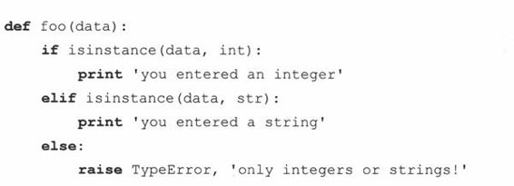 下面的代码检查传递到foo函数的数据对象是否是一个整型或一个字符串,不允许其他类型出现(否则会引发一个异常):