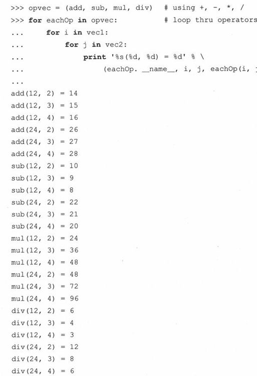 上面这段代码定义了三个向量,前两个包含着操作数,最后一个代表程序员打算对两个操作数进行的一系列操作。最外层循环遍历每个操作运算,而最内层的两个循环用每个操作数向量中的元素组成各种可能的有序数据对。最后,print语句打印出将当前操作符应用在给定参数上所得的运算结果。