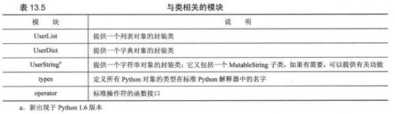 UserList和UserDict,还有新的UserString(从Python1.6版本开始引入)分别代表对列表、字典、字符串对象进行封装的类定义模块。这些模块的主要用处是提供给用户所需要的功能,这样你就不必自己动手去实现它们了,同时还可以作为基类,提供子类化和进一步定制的功能。Python语言已经为我们提供了大量有用的内建类型,但这种“由你自己定制”类型的附加功能使得Python语言更加强大。