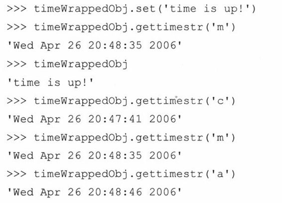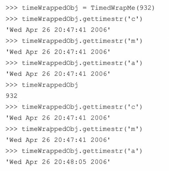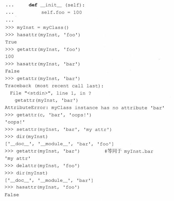 一旦实例被创建后,就可以证实一下,在实例化过程中,我们的实例属性是否确实被__init__()设置了。我们可以通过解释器“转储”实例来查看它是什么类型的对象。(以后我们将学到如何定制类来获得想要的Python对象字符串的输出形式,而不是现在看到的默认的Python对象字符串(<…>))