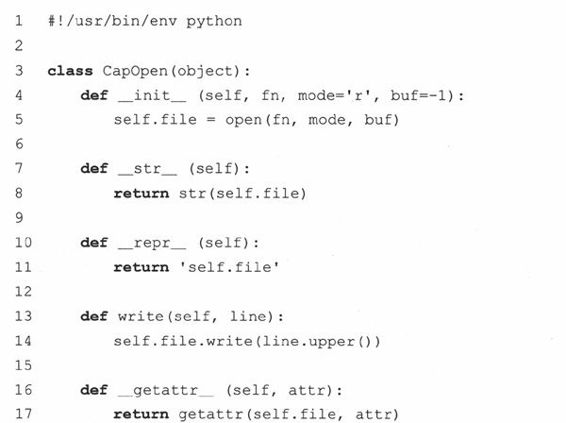 (a)请为示例13.8中的CapOpen类编写一个writelinesO方法。这个新函数将可以一次读入多行文本,然后将文本数据转换成大写的形式,它与write()方法的区别和通常意思上的writelinesO与write()方法之间的区别相似。注意:编写完这个方法后,writelinesO将不再由文件对象“代理”。