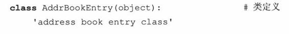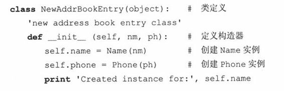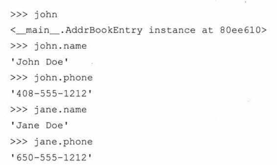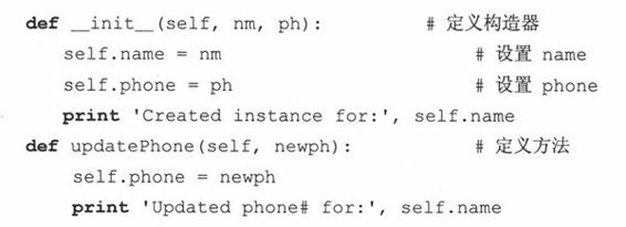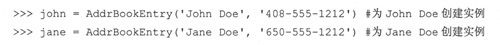 在AddrBookEntry类的定义中,定义了两个方法:__init__()和updatePhone()__init__()在实例化时被调用,即,在AddrBookEntry()被调用时。你可以认为实例化是对__init__()的一种隐式的调用,因为传给AddrBookEntry()的参数完全与__init__()接收到的参数是一样的(除了self,它是自动传递的)。