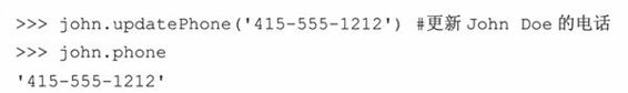 updatePhone()方法需要一个参数(不计self在内):新的电话号码。在updatePhone()之后,立即检查实例属性,可以证实已生效。