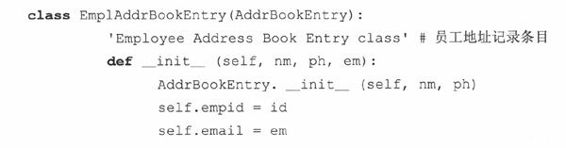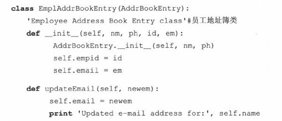 如果需要,每个子类最好定义它自己的构造器,不然,基类的构造器会被调用。然而,如果子类重写基类的构造器,基类的构造器就不会被自动调用了——这样,基类的构造器就必须显式写出才会被执行,像我们上面那样,用AddrBookEntry.__init__()设置名字和电话号码。我们的子类在构造器后面几行还设置了另外两个实例属性:员工ID和电子邮件地址。