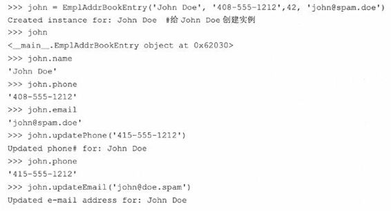 回忆一下,当方法在实例中被调用时,self(实例对象)参数自动由解释器传递,所以在上面的__init__()中,需要的参数是nm和ph,它们分别表示名字和电话号码。__init__()在实例化时,设置这两个属性,以便在实例从实例化调用中返回时,这两个属性对程序员是可见的。你可能已猜到,updatePhone()方法的目的是替换地址本条目的电话号码属性。