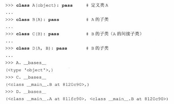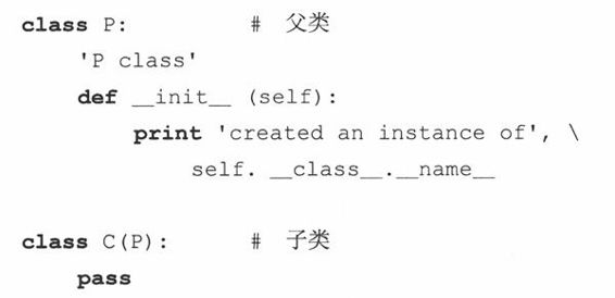 靠继承来进行子类化是创建和定制新类类型的一种方式,新的类将保持已存在类所有的特性,而不会改动原来类的定义(指对新类的改动不会影响到原来的类——译者注)。对于新类类型而言,这个新的子类可以定制只属于它的特定功能。除了与父类或基类的关系外,子类与通常的类没有什么区别,也像一般类一样进行实例化。注意下面,子类声明中提到了父类: