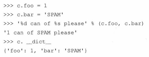 类既可以很简单,也可以很复杂,这全凭你的需要。最简单的情况,类仅用作名称空间(namespace)(参见第11章)。这意味着你把数据保存在变量中,对他们按名称空间进行分组,使得他们处于同样的关系空间中——所谓的关系是使用标准Python句点属性标识。例如,你有一个本身没有任何属性的类,使用它仅对数据提供一个名字空间,让你的类拥有像Pascal中的记录集(record)和C语言中的结构体(structure)一样的特性,或者换句话说,这样的类仅作为容器对象来共享名字空间。