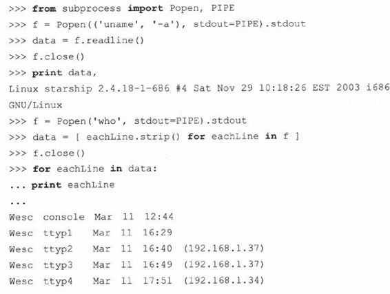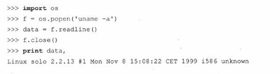 popen()函数是文件对象和system()函数的结合。它工作方式和system()相同,但它可以建立一个指向那个程序的单向连接,然后像访问文件一样访问这个程序。如果程序要求输入,那么你要用‘w’模式写入那个命令来调用popen()。你发送给程序的数据会通过标准输入接收到。同样,‘r’模式允许spawn命令,那么当它写入标准输出的时候,你就可以通过类文件句柄使用熟悉的file对象的read*()方法来读取输入。就像对于文件,当使用完毕以后,你应当close()连接。在上面其中一个使用system()的例子中,我们调用了unix程序uname来给我们提供机器和使用的操作系统的相关信息。该命令产生了一行输出,并直接写到屏幕上。如果想要把该字符串读入变量中并执行内部操作或者把它存储到日志文件中,我们可以使用popen()。实际上,代码如下所示: