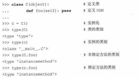UDM (User-defined method,用户定义的方法)包含在类定义之中,只是拥有标准函数的包装,仅有定义它们的类可以使用。如果没有在子类定义中被覆盖掉,也可以通过子类实例来调用它们。正如在13章解释的那样,UDM与类对象是关联的(非绑定方法),但是只能通过类的实例来调用(绑定方法)。无论UDM是否绑定,所有的UMD都是相同的类型——“实例方法”,如在下面例子看到的type()调用: