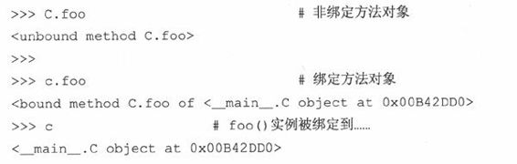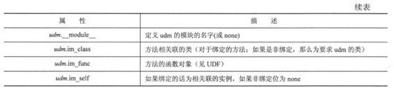 表11.4中展示了UDM的属性。访问对象本身将会揭示你正在引用一个绑定方法还是非绑定方法。正如你从下面看到的,绑定的方法揭示了方法绑定到哪一个实例。