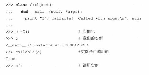 Python给类提供了名为__call__的特别方法,该方法允许程序员创建可调用的对象(实例)。默认情况下,__call__()方法是没有实现的,这意味着大多数实例都是不可调用的。然而,如果在类定义中覆盖了这个方法,那么这个类的实例就成为可调用的了。调用这样的实例对象等同于调用__call__()方法。自然地,任何在实例调用中给出的参数都会被传入到__call__()中。那么foo()就和foo.__call__(foo)的效果相同,这里foo也作为参数出现,因为是对自己的引用,实例将自动成为每次方法调用的第一个参数。如果__call__()有参数,比如(self, arg),那么foo(arg)就和调用foo.__call__(foo,arg)—样。这里我们给出一个可调用实例的例子,和前面小节的例子相似: