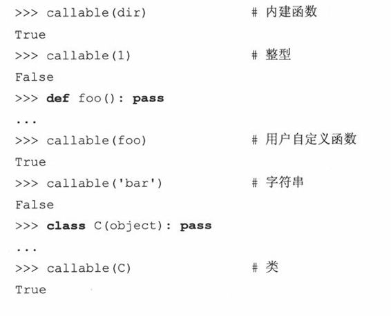 许多的Python对象都是我们所说的可调用的,即是任何能通过函数操作符“()”来调用的对象。要调用可调用对象,函数操作符得紧跟在可调用对象之后。比方说,用“foo()”来调用函数“foo”。可调用对象可以通过函数式编程接口来进行调用,如apply()、filter()、map()和reduce(),这4个接口我们都在11章讨论过了。Python有4种可调用对象:函数、方法、类、以及一些类的实例。记住这些对象的任何引用或者别名都是可调用的。