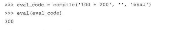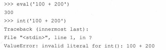 在这种情况下,eval()接收一个字符串并把“100+200”作为表达式求值,当进行整型加法后,给出返回值300。而对int()的调用失败了,因为字符串参数不是能代表整型的字符串,因为在字符串中有非法的文字,即,空格以及“+”字符。可以这样理解eval()函数的工作方式:对表达式两端的引号视而不见,接着假设“如果我是Python解释器,我会怎样去观察表达式呢?”,换句话说,如果以交互方式输入相同的表达式,解释器会做出怎么样的反应呢?按下回车后的结果应该和eval()返回的结果相同。