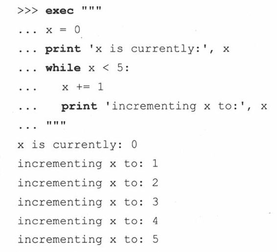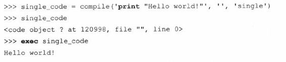 被执行的对象(obj)可以只是原始的字符串,比如单一语句或是语句组,它们也可以预编译成一个代码对象(分别用“single”和“exec”参数)。下面的例子中,多个语句作为一个字符串发送给exec: