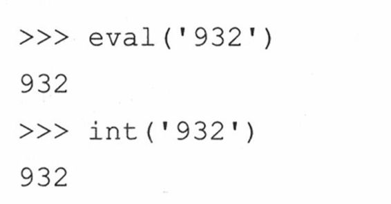 在这种情况下,eval()和int()都返回相同的结果:整型932。然而,它们采用的方式却不尽相同。内建函数eval()接收引号内的字符串并把它作为Python表达式进行求值。内建函数int()接收代表整型的字符串并把它转换为整型。这只有在该字符串只由字符串932组成的时候才会成功,而该字符串作为表达式返回值932,932也是字符串”932”所代表的整型。当我们用纯字符串表达式的时候,两者便不再相同了: