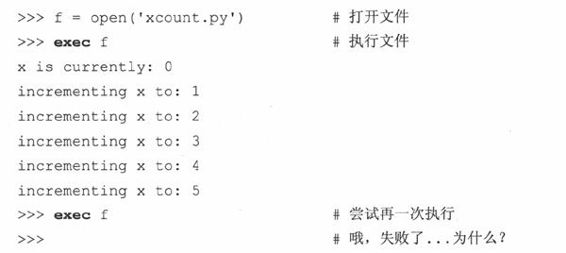 注意一旦执行完毕,继续对exec的调用就会失败。呃,并不是真正的失败……只是不再做任何事,这或许让你感到吃惊。事实上,exec已从文件中读取了全部的数据且停留在文件末尾(end-of-file, EOF)。当用相同文件对象对exec进行调用的时候,便没有可以执行的代码了,所以exec什么都不做,如同上面看见的行为。我们如何知道它在EOF呢?