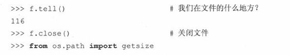 我们用文件对象的tell()方法来告诉我们处于文件的何处,然后用os.path.getsize()来告诉我们 xcount.py脚本有多大。这样你就会发现,两个数字完全一样: