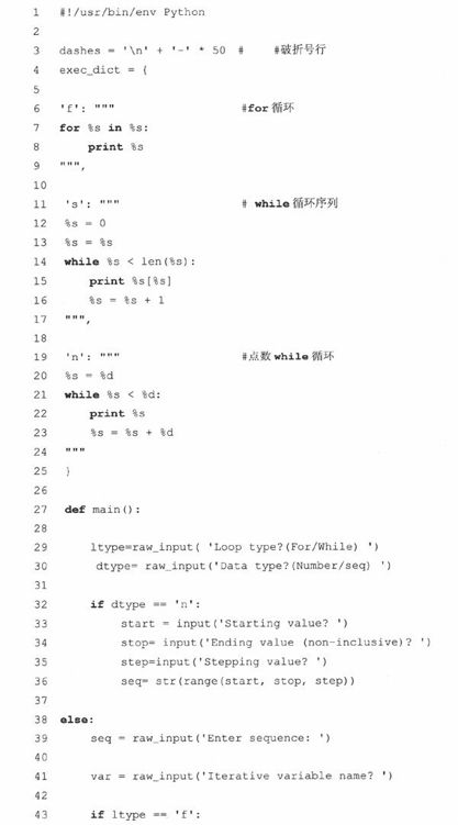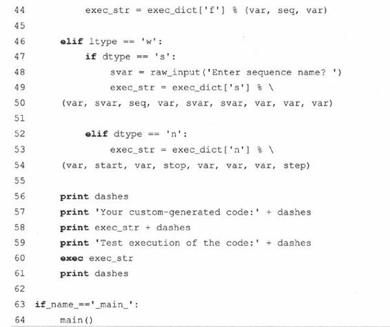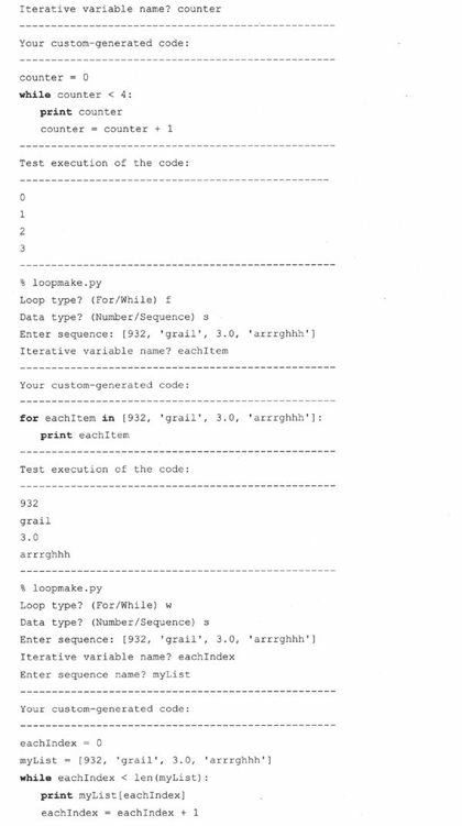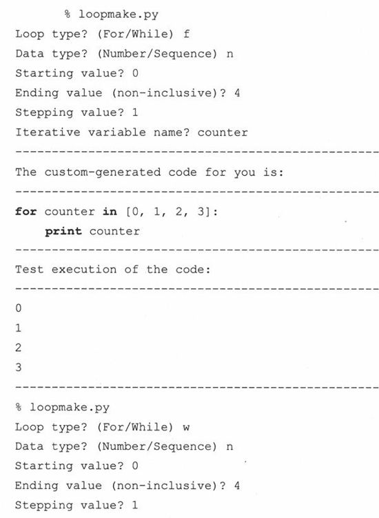第一个例子是loopmake.py脚本,一个简单的、迅速生成的和执行循环的计算机辅助软件工程(computer-aided software engineering,CASE)。它提示用户给出各种参数(比如,循环类型(while或for),迭代的数据类型(数字或序列)),生成代码字串,并执行它。