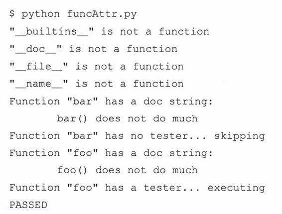 从11.9小节中我们可以看到,一旦函数声明以后(且函数对象可用),程序员也可以自定义函数属性。所有的新属性变成udf.__dict__对象的一部分。在本章的稍后内容中,我们将讨论获取含有Python代码的字符串并执行该代码。到了本章最后,会有一个组合例子,着重描写函数属性和Python代码(字符串)的动态求值和执行语句。