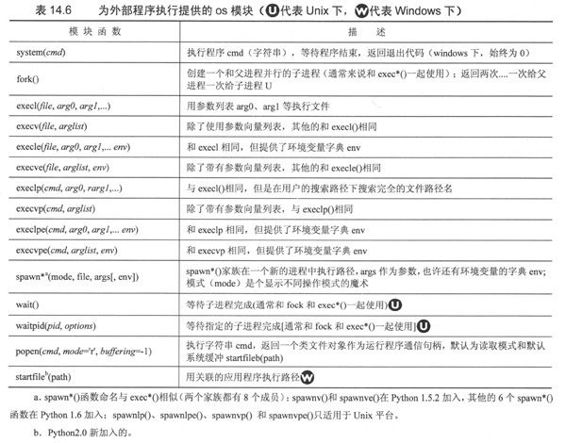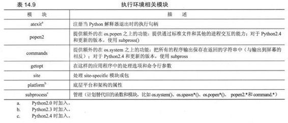 在表14.9中,除了os和sys模块,你还可以找到与这章执行环境主题相关的模块列表。
