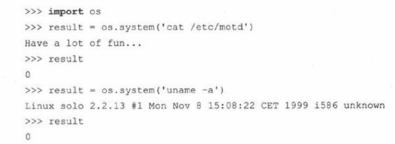 作为例子,我们执行了两个从交互解释器中获取程序输入的命令,这样你便可以观察system()是如何工作的。