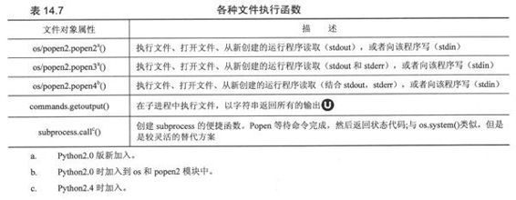 最终,程序员必须考虑Python脚本是否必须和其他将要执行的程序通信。有些程序需要输入,而有的程序返回输出以及执行完成时的错误代码,也许有的两者都做。针对不同的环境,Python提供了各种执行非Python程序的方法。在本节讨论的所有函数都可以在os模块中找到。在表14.6中,我们做了总结(我们会对那些只适合特定平台的函数进行标注),作为对本节剩余部分的介绍。