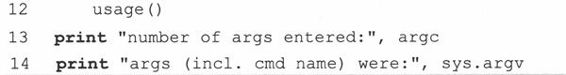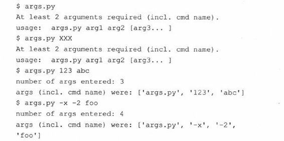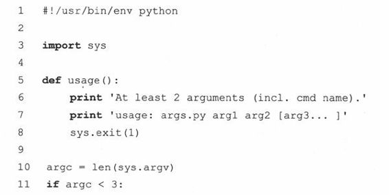 sys.exit()经常用在命令调用的中途发现错误之后,比如,如果参数不正确,无效,或者参数数目不正确。下面的例子14.4 (args.py)仅仅是一个测试脚本,在正确执行之前需要给出确定数目的参数。