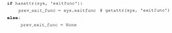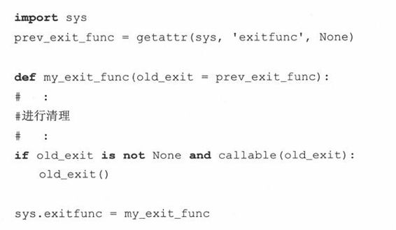 在清理执行以后,我们执行了老的exit()函数。getattr()调用只是检查了先前的exitfunc()是否已经定义。如果没有,那么prev_exit_func赋值为None,否则,prev_exit_func变成exit函数新的别名,然后作为参数传入我们的新exit函数,my_exit_func。