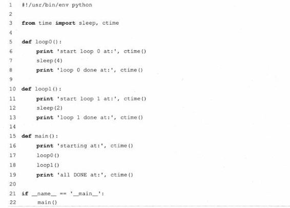 我们要创建两个“计时循环”。一个睡眠4秒种,一个睡眠2秒种,分别是loop0()和loopl()。(我们命名为“loop0”和“loop1”表示我们将有一个循环的序列)。如果我们像例18. 1的onethr.py中那样,在一个进程或一个线程中,顺序地执行loop0()和loop1(),那运行的总时间为6秒。在启动loop0(),loop1()和其他的代码时,也要花去一些时间,所以,我们看到的总时间也有可能会是7秒钟。