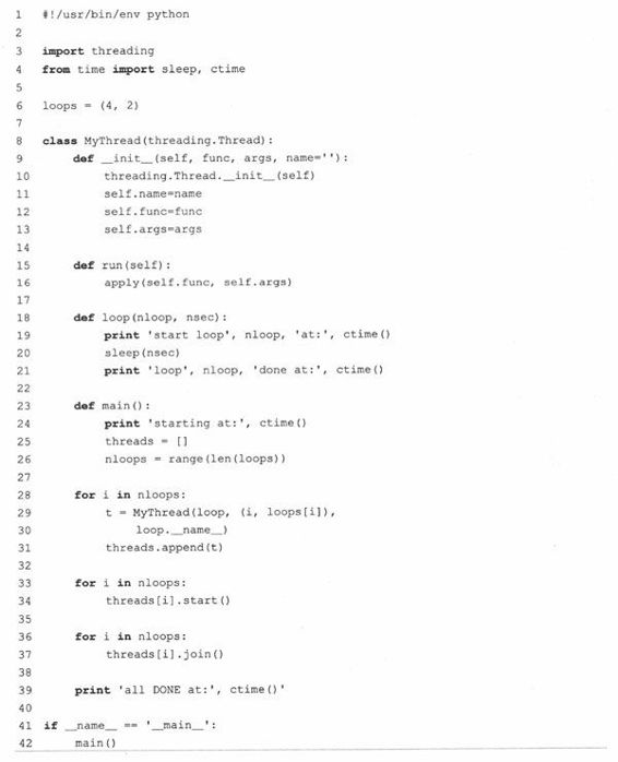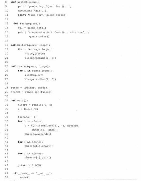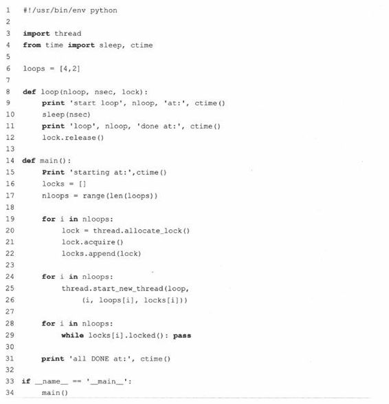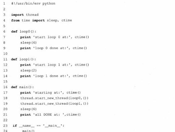 不过,出于对学习Python和线程的兴趣,我们将给出一点使用thread模块的例子。这些代码只用于学习目的,让你对为什么应该避免使用thread模块有更深的认识,以及让你了解在把代码改为使用threading和Queue模块时,我们能获得多大的便利。