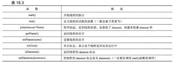 threading的Thread类是你主要的运行对象。它有很多thread模块里没有的函数,详见表18.3。