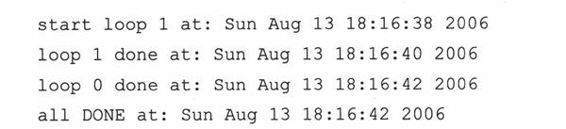 睡眠4秒和2秒的代码现在是并发执行的。这样,就使得总的运行时间被缩短了。可以看到,loop1甚至在loop()前面就结束了。程序的一大不同之处就是多了一个“sleep(6)”的函数调用。为什么要加上这一句呢?因为如果我们没有让主线程停下来,那主线程就会运行下一条语句,显示“all done”,然后就关闭运行着loop0()和loop1()的两个线程,退出了。