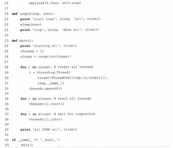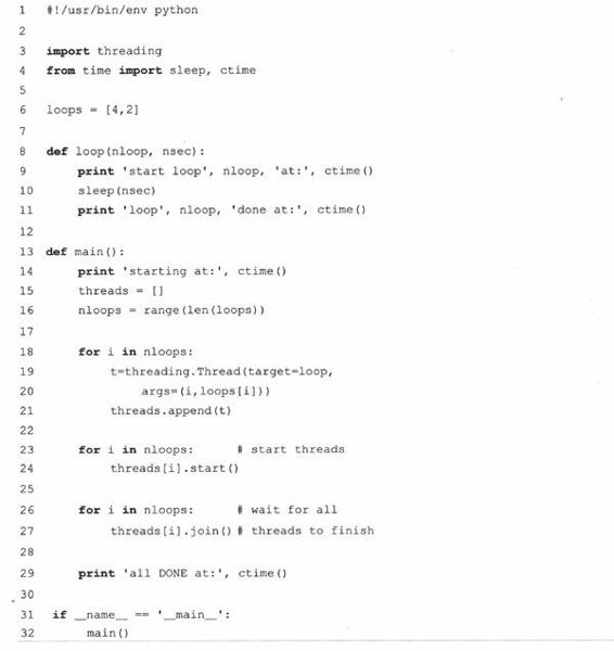现在,把线程加入到我们的onethr.py例子中。稍微改变一下loop*()函数的调用方法,我们得到了例18.2的mtsleepl.py。