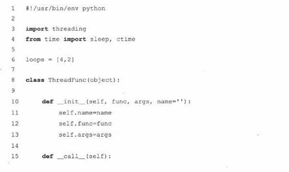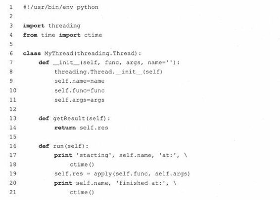 创建新线程的时候,Thread对象会调用我们的ThreadFunc对象,这时会用到一个特殊函数call()。由于我们已经有了要用的参数,所以就不用再传到Thread()的构造器中。由于我们有一个参数的元组,这时要在代码中使用apply()函数。如果你使用的是Pythonl.6或是更高版本,你可以使用11.6.3节中所说的新的调用语法,而不用像第16行那样使用apply()函数: