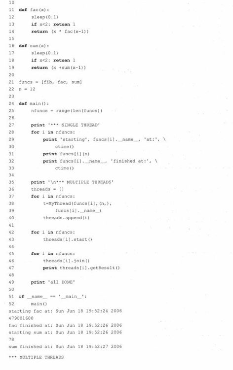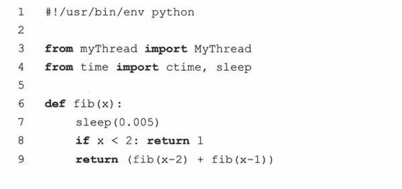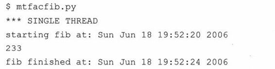 例18.8中的mtfacfib.py脚本比较了递归求斐波那契、阶乘和累加和函数的运行。脚本先在单线程中运行这三个函数,然后在多线程中做同样的事,以说明多线程的好处。