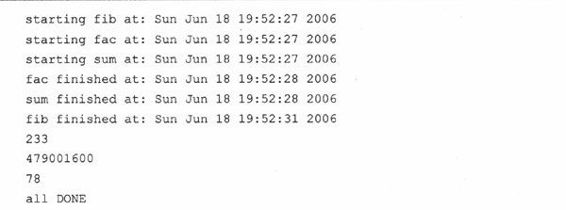 由于这些函数运行得很快(斐波那契函数会慢一些),你会看到,我们得在每个函数中加上一个sleep()函数,让函数慢下来,以便于我们能方便地看到多线程能在多大程度上加速程序的运行。不过实际工作中,你一般不会想在程序中加上sleep()函数的。下面是程序的输出: