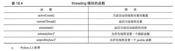 除了各种同步对象和线程对象外,threading模块还提供了一些函数。见表18.4。