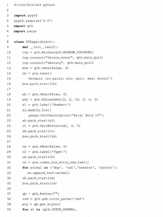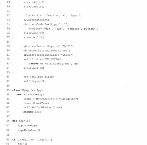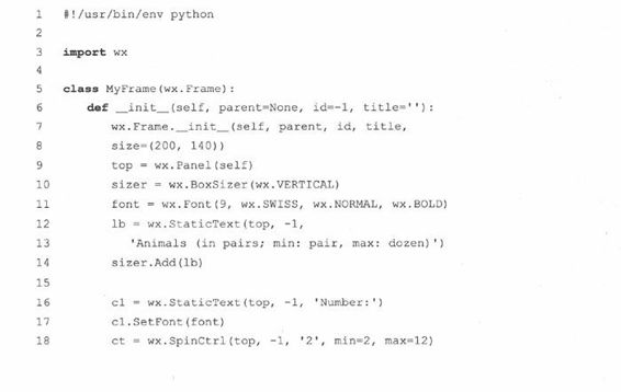 然而,为了让微调按钮和组合框的静态文本能出现它们的左侧(wxPython例子中出现在上方),我们创建了小型的水平走向的方框来包括标签组件对(18〜36行),而且还把这些HBox完全置于VBox的掌控之下。