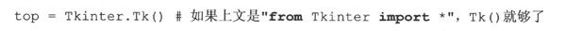 在GUI程序中,会有一个顶层根窗口对象,它包含着所有小窗口对象,它们共同组成一个完整的GUI程序。这些小窗口对象可以是文字标签、按钮、列表框等等。这些独立的GUI构件就是所谓的组件。所以当我们说创建一个顶层窗口的时候,我们实际上是指你需要一个放置所有组件的地方。典型的Python语句如下行: