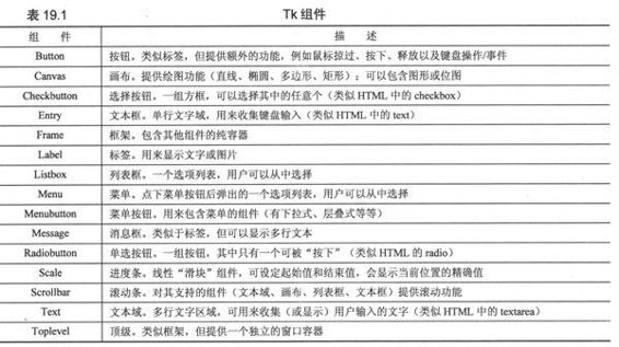 Tk目前有15种组件。我们在表19.1中列出了它们。