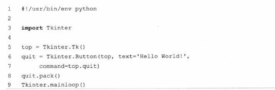第二个例子和第一个很相似。但我们这次将创建一个按钮而不只是显示一个简单的文字标签。例19.2是tkhello2.py的源码。