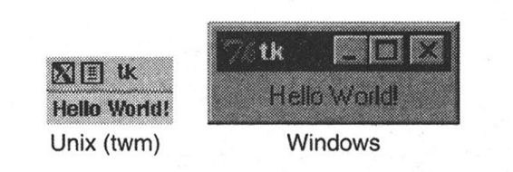 第一行,我们先创建了一个顶层窗口。随后是写着那串举世闻名的字符的标签组件。我们指明用packer来管理和显示组件,并最终调用mainloop()来运行GUI程序。图19-1展示了运行该GUI程序后,你将会看到的效果。