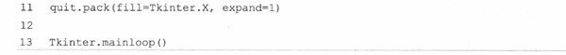 除了对组件新加的参数,我们还看到对packer的一些参数。fill参数告诉packer让QUIT按钮填充水平方向的剩余空间,而expand参数则引导packer填充了水平方向的所有可视空间,并拉伸按钮到达窗口的左右边界。